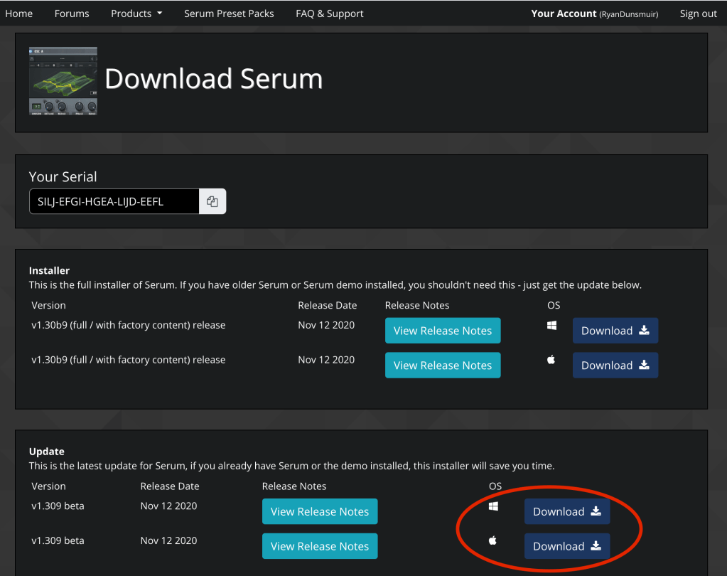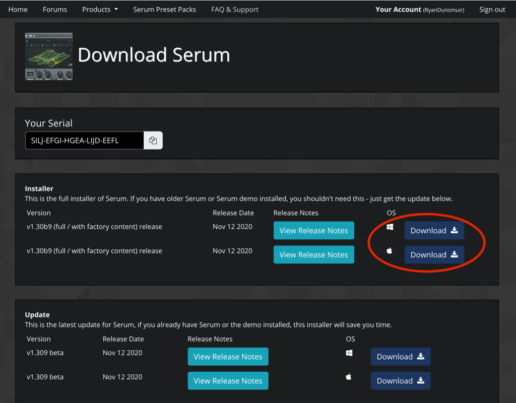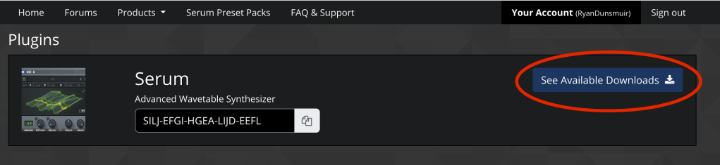 4. On the account page, under Plugins > Serum select “See Available Downloads”