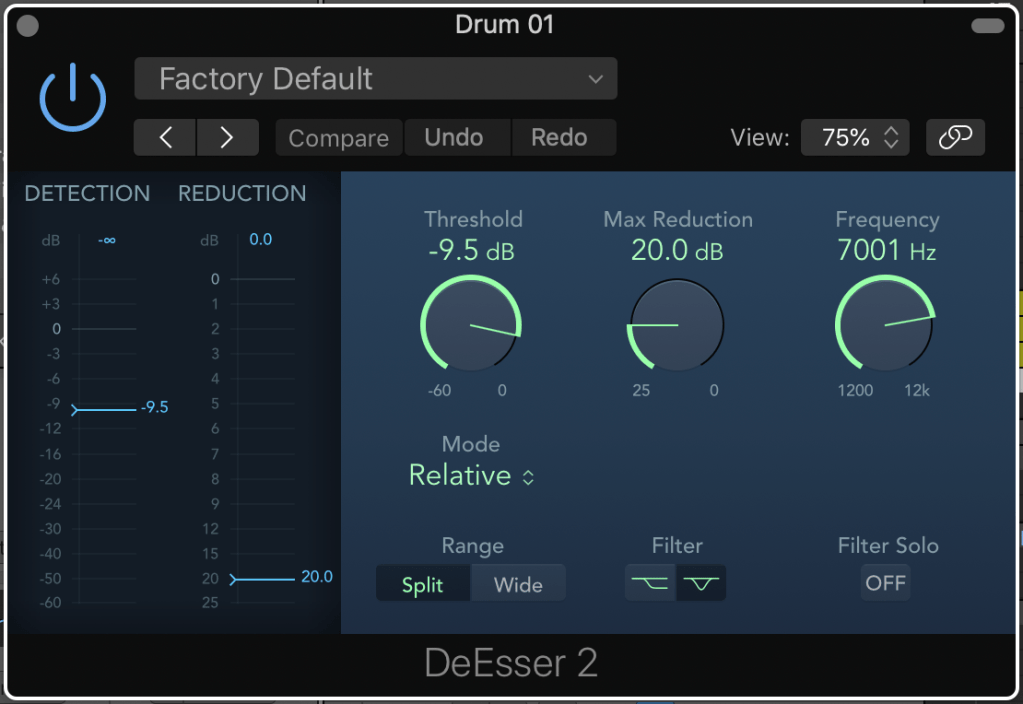 - Be mindful of its position in the FX chain, it is common practice to place the De-Esser last in the chain after compression and EQ.